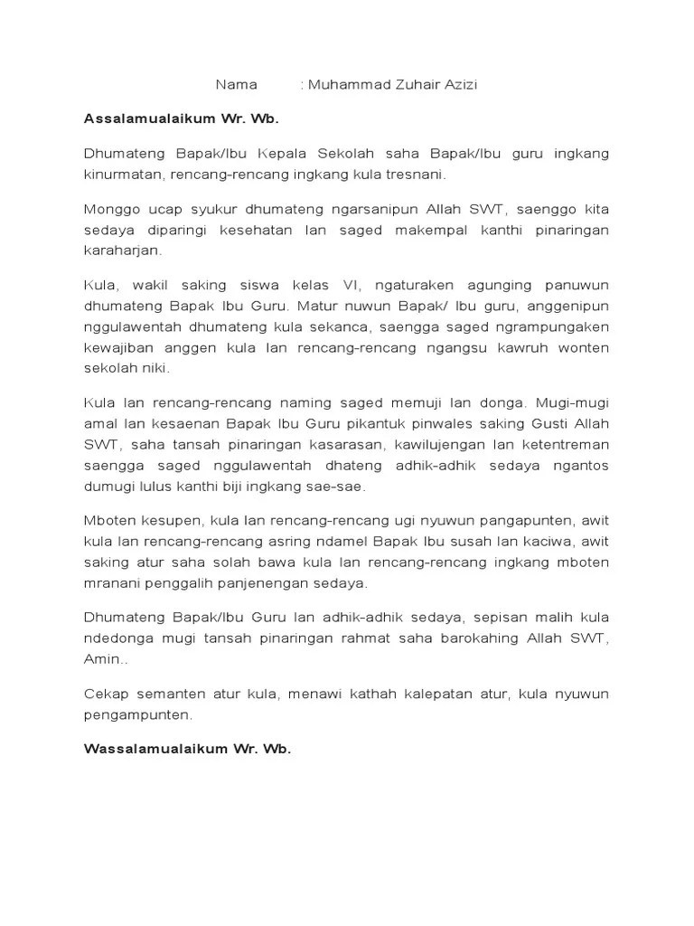 Bapak kepala sekolah, bapak lan ibu guru ingkang kulo . Contoh pidato basa jawa tentang perpisahanbonus pulsa 10k bagi ynag. Contoh pidato bahasa jawa sumpah . Bahasa jawa juga masih sering digunakan dalam pidato di area jawa karena itu . Terakhir adalah contoh pidato perpisahan sekolah bahasa jawa.